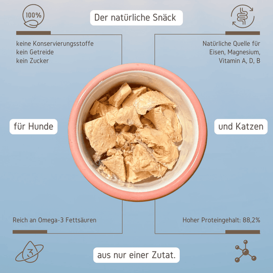 ✔️ Gefriergetrocknete SNÄCKS = 100 % purer Fleischgenuss 🍖 Huhn, Leber, Lachs, Garnele – immer eine Zutat, immer natürlich.